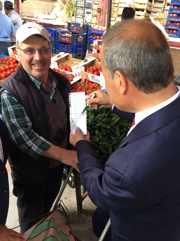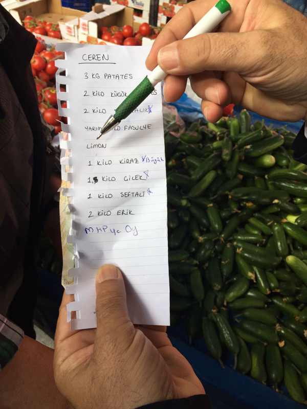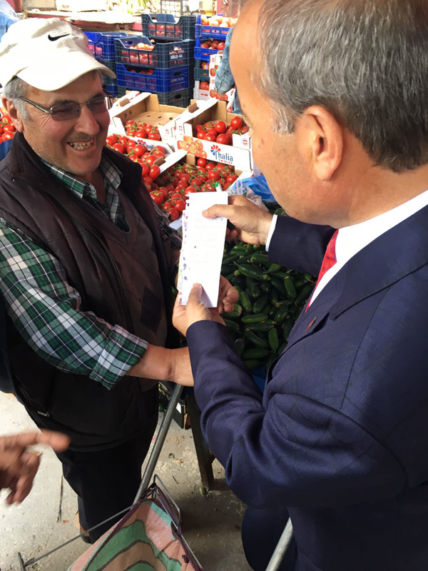 Sipariş listelerini alarak limon, çilek, patates bulunan listenin en sonuna ‘MHP’ye oy’ yazan Taytak, herkesi gülümsetti.