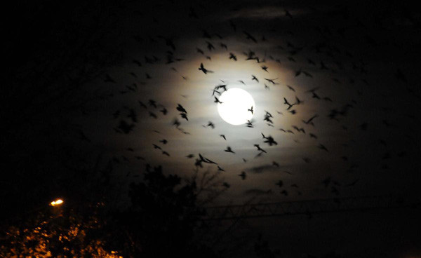 Erzurum Güncel- Erzurum'da akşam saatlerinde Atatürk üniversitesi yerleşkesinde bulutların arasında beliren dolunay, ağaçlardan hareketlenen kuşlarla birleşti.
