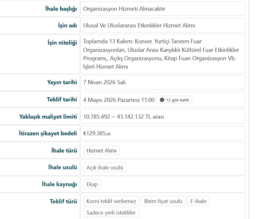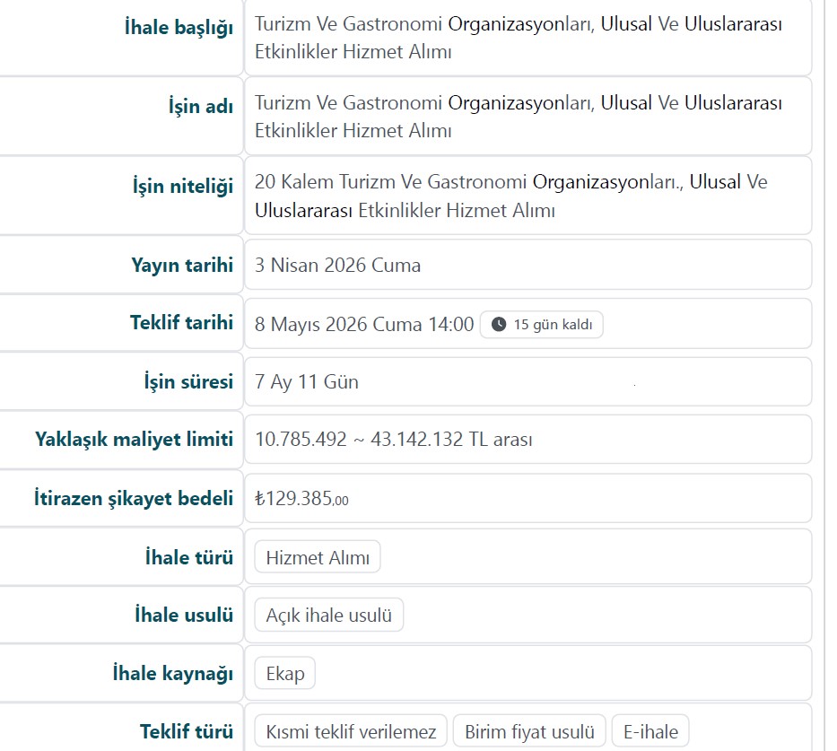 Belediyenin Gençlik ve Spor Hizmetleri Daire Başkanlığı tarafından açılan ihalelerin detayları dudak uçuklatıyor: Birinci İhale ‘Ulusal ve Uluslararası Etkinlikler Hizmet Alımı’ başlığıyla 4 Mayıs 2026’da yapılacak. Konserlerden kitap fuarlarına kadar 13 kalemi kapsayan bu işin yaklaşık maliyeti 43 milyon TL’ye kadar çıkıyor. İkinci ihale ise ‘Turizm ve Gastronomi Organizasyonları ile Ulusal ve Uluslararası Etkinlikler’ adı altında 8 Mayıs 2026’da düzenlenecek. Bu ihalede de yine benzer şekilde 20 kalem iş bulunuyor ve maliyet limiti yine 43 milyon TL bandında. Her iki ihalenin de iş bitiş tarihi 31 Aralık 2026 olarak belirlenmiş durumda.