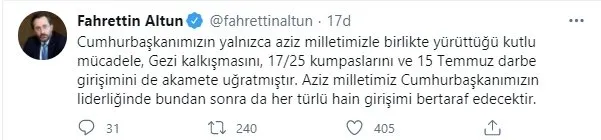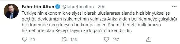Erzurum Güncel- Altun'un twitter üzerinden yaptığı açıklamada Türkiye'nin ekonomik toparlanma ve kalkınma dönemine girdiği 7 Şubat'ta organize edilen kumpasın başlangıç ve sona erdirilmesi arasındaki sürece dair değerlendirmeler yer aldı. Altun "Bu kumpas yine Cumhurbaşkanımız Recep Tayyip Erdoğan’ın üstün liderliği ve kararlı duruşuyla bertaraf edildi. Liderimiz, aziz milletimizden aldığı güçle, devletimizi ve milletimizi bu cendereden çıkardı." dedi.