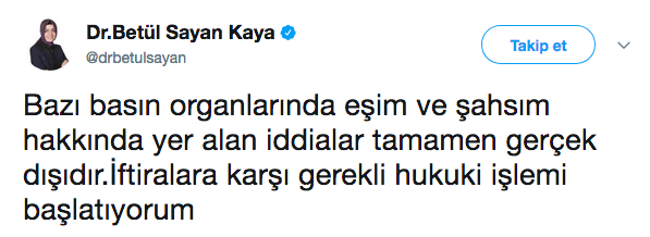 Kaya, ''Bazı basın organlarında eşim ve şahsım hakkında yer alan iddialar tamamen gerçek dışıdır.İftiralara karşı gerekli hukuki işlemi başlatıyorum'' diye konuştu.