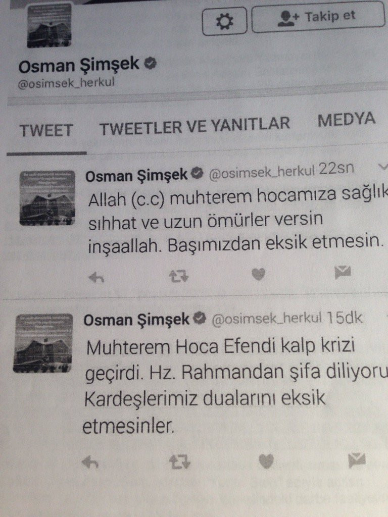 "Pensilvanya'daki yardımcılarından Osman Şimşek, F. Gülen'in kalp krizi geçirdiğini duyurdu. Hastahaneye götürürlerse Gülen'i öldürebilirler"