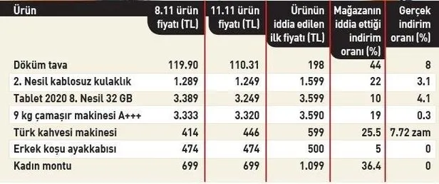 Örneğin bir döküm tava pazar günü sitelerde 119.90 liraya satışa sunulurken dün ürünün sitelerdeki satış fiyatı 109 liraydı. Yani yüzde 9'luk bir indirim söz konusu. Ancak sitede satıcı firma ürünü 198 liradan gösterip yüzde 44'lük bir indirim algısı yaratmış. Yine pazar günü 414 liradan satışa sunulan bir Türk kahvesi makinesi 11.11'de aynı sitede 446 liradan satışa sunulmuş. Normalde bu üründe indirim değil zam var ancak ilk fiyat olarak rakam 667 lira gösterildiği için sanki firma yüzde 30'u aşan bir indirim yapmış gibi bir yanıltma yapılmış.