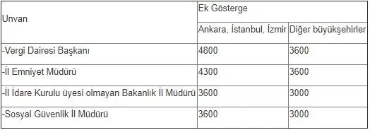 Kadro unvanları aynı olmasına rağmen haklarında geçerli olan ek göstergeler, görev yaptıkları yerin Ankara, İstanbul, İzmir illerinden birisi olmasına veya başka illere olmasına bağlı olarak değişen Devlet memurlarının unvanı ve ek göstergeleri aşağıdaki tabloda gösterilmiştir.