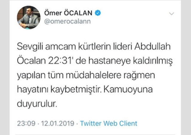 HDP'li Ömer Öcalan'ın hesabından yapılan paylaşımda, “Sevgili amcam, Kürtlerin lideri Abdullah Öcalan 22:31’de hastaneye kaldırılmış, yapılan tüm müdahalelere rağmen hayatını kaybetmiştir. Kamuoyuna duyurulur” ifadeleri yer aldı.
