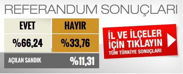 Referandum sonuçlarını canlı yayınla veriyoruz. Aşağıdaki linke tıklayarak iliniz ve ilçenizdeki açılan sandık sayısını, geçerli oyları ve evet - hayır oranlarını görebilirsiniz. 2017 referandum sonuçları için tıklayın!