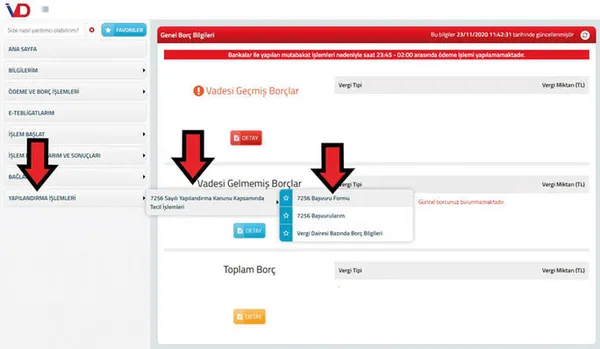 Vergi ve cezalar, motorlu taşıtlar vergisi, trafik para cezası, öğrenim ve katkı kredisi ile idari para cezası gibi çok sayıda borç online olarak yapılandırılabiliyor.