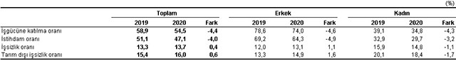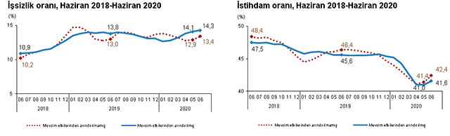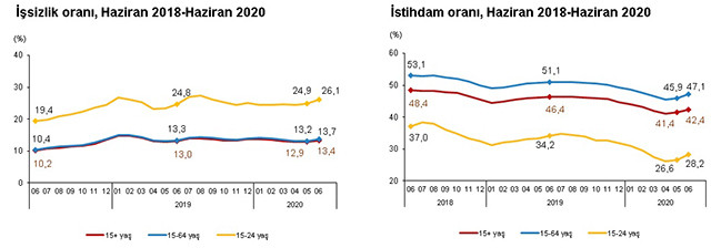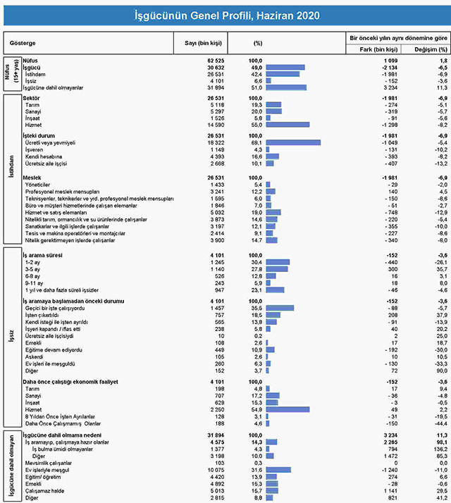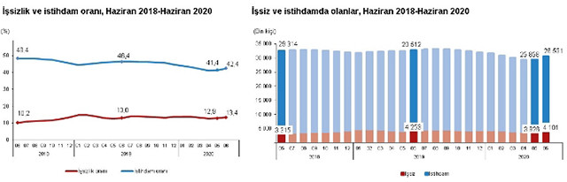 Türkiye genelinde 15 ve daha yukarı yaştakilerde işsiz sayısı 2020 yılı Haziran döneminde geçen yılın aynı dönemine göre 152 bin kişi azalarak 4 milyon 101 bin kişi oldu. İşsizlik oranı 0,4 puanlık artış ile %13,4 seviyesinde gerçekleşti. Tarım dışı işsizlik oranı 0,6 puanlık artış ile %15,9 oldu.