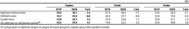15-24 yaş grubunu kapsayan genç nüfusta işsizlik oranı bir önceki yılın aynı dönemine göre 1,3 puanlık artışla %26,1, istihdam oranı ise 6,0 puan azalarak %28,2 oldu. Aynı dönemde işgücüne katılma oranı 7,4 puanlık azalışla %38,1 seviyesinde gerçekleşti. Ne eğitimde ne de istihdamda olanların oranı ise bir önceki yılın aynı dönemine göre 3,1 puanlık artışla %29,3 seviyesinde gerçekleşti.