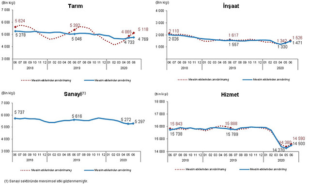 Bu dönemde, istihdam edilenlerin sayısı tarım sektöründe 274 bin, sanayi sektöründe 319 bin, inşaat sektöründe 91 bin, hizmet sektöründe 1 milyon 298 bin kişi azaldı. İstihdam edilenlerin %19,3'ü tarım, %20,0'ı sanayi, %5,8'i inşaat, %55,0'ı ise hizmet sektöründe yer aldı.