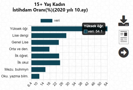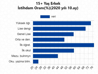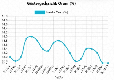 Türkiye genelinde 15 ve daha yukarı yaştakilerde işsiz sayısı 2020 yılı Ekim döneminde geçen yılın aynı dönemine göre 391 bin kişi azalarak 4 milyon 5 bin kişi oldu. İşsizlik oranı 0,7 puanlık azalış ile %12,7 seviyesinde gerçekleşti. Tarım dışı işsizlik oranı 0,9 puanlık azalış ile %14,8 oldu.