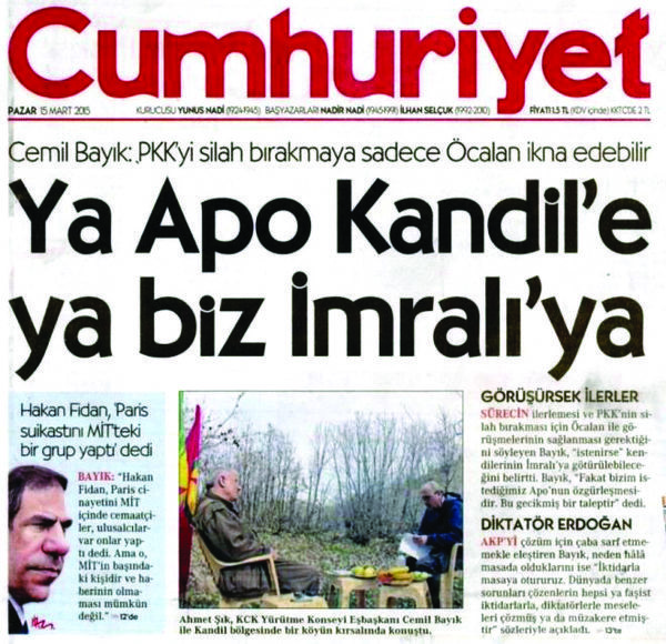 (15 Mart 2015) Cumhuriyet'in tutuklu muhabiri Ahmet Şık'ın terör örgütü elebaşı Cemil Bayık'la yaptığı röportaja yer verildi. Terörist Bayık'ın açıklamaları kamuoyuna duyuruldu.