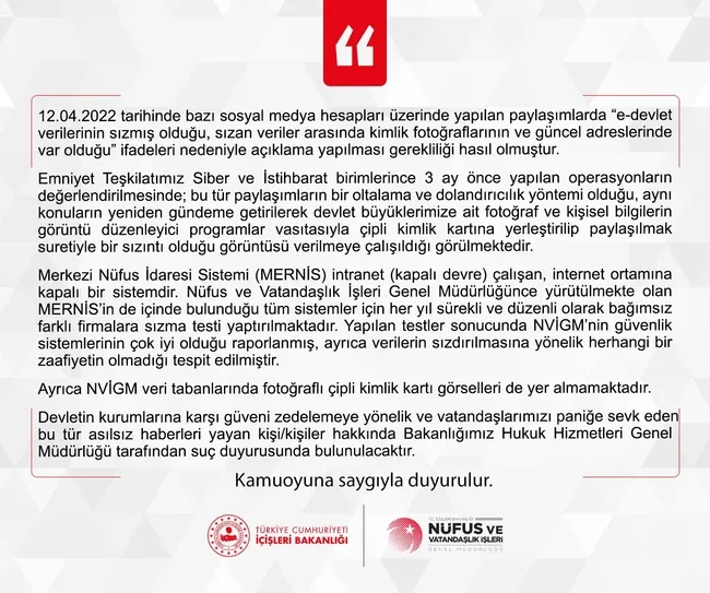 Nüfus Genel Müdürlüğü, "Verilerin sızdırılmasına yönelik herhangi bir zafiyetin olmadığı tespit edilmiştir. Veri tabanlarında çipli kimlik kartı görselleri de yer almamaktadır." açıklamasında bulundu.