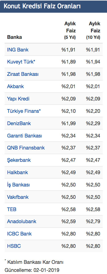 Erzurum Güncel- Konut kredisi faiz oranlarına 2019'un ilk güncellemesi geldi. 2018'de yüzde 3'ün üstüne kadar çıkan faiz oranları 2019'a yüzde 2 seviyelerinde girdi. 10 yıllık konut kredi faiz oranlarında en düşük konut kredisi faiz oranı yüzde 1,91, en yüksek faiz oranı ise yüzde 2,80 olarak açıklandı.