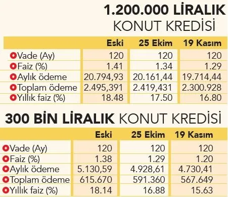 Kamu bankalarının gerçekleştirdiği faiz indirimleri konut kredisi kullanan tüketicilerin cebine olumlu yansıyacak. 25 Ekim öncesi, 10 yıl vadeli 300 bin liralık kredi için 615.7 bin lira geri ödeme yapan tüketici, 25 Ekim'in ardından dün yapılan faiz indirimi ile 567.6 bin TL ödeyecek. Böylece konut kredisi kullanan tüketicinin ödeyeceği faiz 48 bin TL azalmış oldu. 10 yıl vadeli, 1 milyon 200 bin liralık konut kredisi kullanan tüketici, 25 Ekim öncesi toplam 2 milyon 495 bin TL geri ödeme yaparken, bu tutar dün 2 milyon 300 bine geriledi.