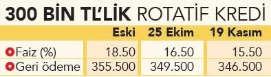 Ekim ayında kurumsal kredi faiz oranlarında ürün ve vade yapısına göre 2 puanlık indirime giden kamu bankaları, dün de bu kredilerin faizini 1 puan daha indirdi. Ziraat Bankası, Vakıfbank ve Halkbank 25 Ekim'de yıllık yüzde 18.5-19.25 aralığında olan rotatif kredilerin faizini yüzde 16.5'e çekmişti. Dün atılan adımla bu kredinin faizi yüzde 15.50'ye kadar geriledi. Böylece 300 bin liralık bir kredi için ödenen faiz yapılan 2 indirimle yaklaşık 10 bin lira azalmış oldu. Kamu bankaları dün konut kredilerinde de indirime gitti.