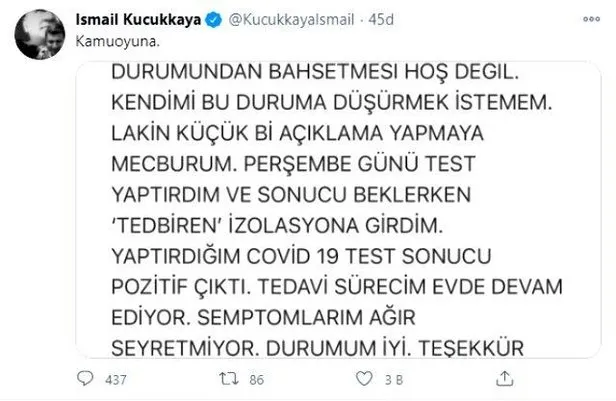 Kendimi bu duruma düşürmek istemem. Lakin küçük bir açıklama yapmaya mecburum. Perşembe günü test yaptırdım ve sonucu beklerken tedbiren izolasyona girdim. Yaptırdığım testin sonucu pozitif çıktı." ifadelerini kullandı.