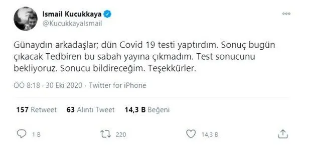 Erzurum Güncel- Fox TV sunucu İsmail Küçükkaya'nın, geçen gün sunduğu programa çıkmaması soru işaretlerini de beraberinde getirmişti. Sosyal medya hesabından paylaşımda bulunan Küçükkaya, "Günaydın arkadaşlar; dün Covid 19 testi yaptırdım. Sonuç bugün çıkacak Tedbiren bu sabah yayına çıkmadım. Test sonucunu bekliyoruz. Sonucu bildireceğim. Teşekkürler" ifadelerine yer verdi.
