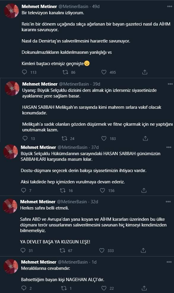 Erzurum Güncel- Metiner'in Nagehan Alçı ile ilgili sosyal medyada yaptığı paylaşımlar şöyle: