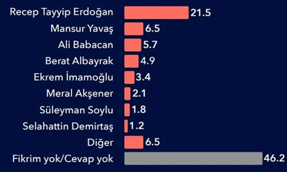 Ankete göre ülke ekonomisini en iyi yönetecek isim yüzde 22 ile 18 yıldır yönetimde olan AKP’li Cumhurbaşkanı Recep Tayyip Erdoğan oldu.