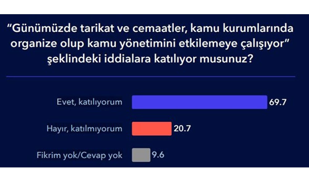 Ankette katılımcılara “Günümüzde tarikat ve cemaatler, kamu kurumlarında organize olup kamu yönetimini etkilemeye çalışıyor şeklindeki iddialara katılıyor musunuz?” sorusu da yöneltildi.