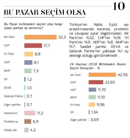 Ağustosta CHP'nin oyu yüzde 21,2 olarak görülürken, Eylül ayında yüzde 17,7'ye düştü. AK Parti ise yüzde 31.3'lük oy oranından yüzde 32.3'e yükseldi.