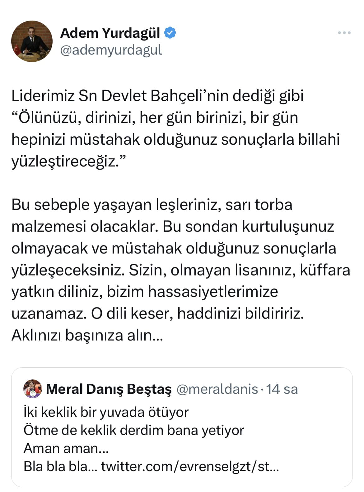 MHP Lideri Devlet Bahçeli’nin, “Ölünüzü, dirinizi, her gün birinizi, bir gün hepinizi müstahak olduğunuz sonuçlarla billahi yüzleştireceğiz” sözlerini paylaşan Yurdagül, “ Bu sebeple yaşayan leşleriniz, sarı torba malzemesi olacaklar. Bu sondan kurtuluşunuz olmayacak ve müstahak olduğunuz sonuçlarla yüzleşeceksiniz. Sizin, olmayan lisanınız, küffara yatkın diliniz, bizim hassasiyetlerimize uzanamaz. O dili keser, haddinizi bildiririz. Aklınızı başınıza alın…” ifadelerini kullandı.