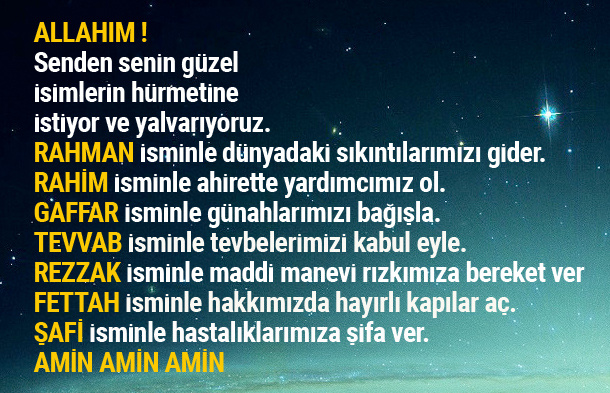 Şu mübarek gece hürmetine Bizleri bağışla, öyle bir dünyada hayata gözlerimizi açtık ve öyle bir alemde yaşıyoruz ki, önümüzde tuzak, arkamızda tuzak; uğrayıp geçtiğimiz her yerde nefis, şeytan ve aynı takımdan binlerce ifrit ağını germiş av bekliyor; yol boyu yüzlerce fitne ocağı ve isi-dumanı gelip sinelerimize oturuyor. İnayetine ihtiyacımız açık, çaresizliğimiz her halimizden belli; bizleri yara-bere almadan hedefe ancak Sen ulaştırabilir ve bu güne kadar elli defa çatlamış, kırılmış ruh dünyamızı da ancak Sen tamir edebilirsin. İçimizi Sana döküyor, kusurlarımızı Sana açıyor ve bize yeniden insan olma yollarını göstermeni diliyoruz ya Rabbi!