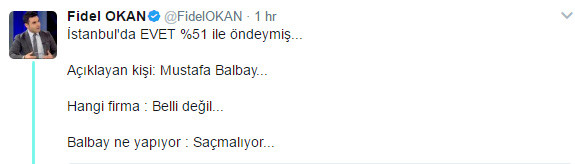 CHP İzmir Milletvekili Mustafa Balbay, 16 Nisan'daki referandumda İstanbul'da "evet" oylarının yüzde 51 olduğunu ileri sürdü. Anket oranına tepki gösteren Fidel Okan, anketi yapan firmanın belirtilmediğini ifade ederken, Baybal'ın da saçmaladığını söyledi.