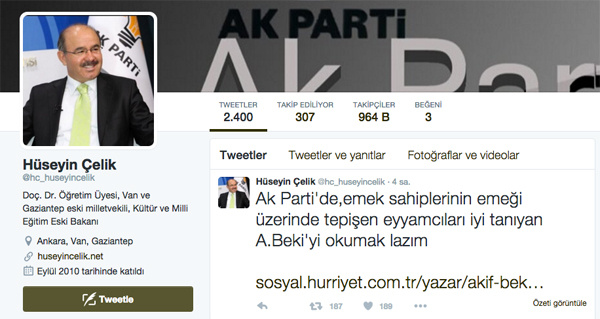 Eski Adalet Bakanı Sadullah Ergin, sabah Akif Beki'nin bu yazısını paylaşırken, eski AK Parti Genel Başkanı Danışmanı Hüseyin çelik ise aynı saatlerde "AK Parti'de, emek sahiplerinin emeği üzerinde tepişen eyyamcıları iyi tanıyan A.Beki'yi okumak lazım" diyerek, sosyal medyadan takipçilerine o yazıyı tavsiye etti.