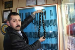 Erzurum Güncel - Erzurum'da Oltu taşı işletmecisi Ertuğrul Erkin Asan, 5 kilogram ağırlığında bir tespih yaptı. Oltu Taşı El Sanatları İş Merkezi'nde 11 yıldır Oltu taşı işletmecisi olarak çalışan Ertuğrul Erkin Asan (32), yıllardır biriktirmiş olduğu taşlarla yaklaşık 5 kilogram ağırlığında bir tespih yaptı. Asan, 3 ayda kenarlarını firuze, yakut ve zümrütle yapmış olduğu tespihin her tanesine Allah'ın 99 ismini gümüş işlemesiyle yazdı. Tespihin değerinin 8 bin lira olduğunu söyleyen Asan, tespihin müşterisinin çok olduğunu fakat satmayacağını, tamamen koleksiyon amaçlı olduğunu dile getirdi. Tespihi çekmek için babayiğit bir bileğe sahip olmak gerektiğini ifade eden Asan, "Dünyanın en büyük tespihini yapmanın gururunu yaşıyorum. Her tespih ustasının böyle bir tespih yapma isteği vardır fakat bu kadar büyük taş bulmak çok zor" dedi.