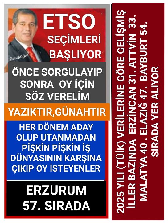 Gazete Güncel- Erzurum ticaret hayatının kalbi ETSO’da seçim heyecanı artarken, mevcut yönetime yönelik 'temsiliyet ve yetersizlik' eleştirileri ses getiren bir protestoya dönüştü. Sosyal medyada paylaşılan ve iş dünyasında hızla yayılan veriler, Erzurum’un sosyo-ekonomik gelişmişlikte bölge illerinin gerisinde kaldığını bir kez daha ortaya koydu.