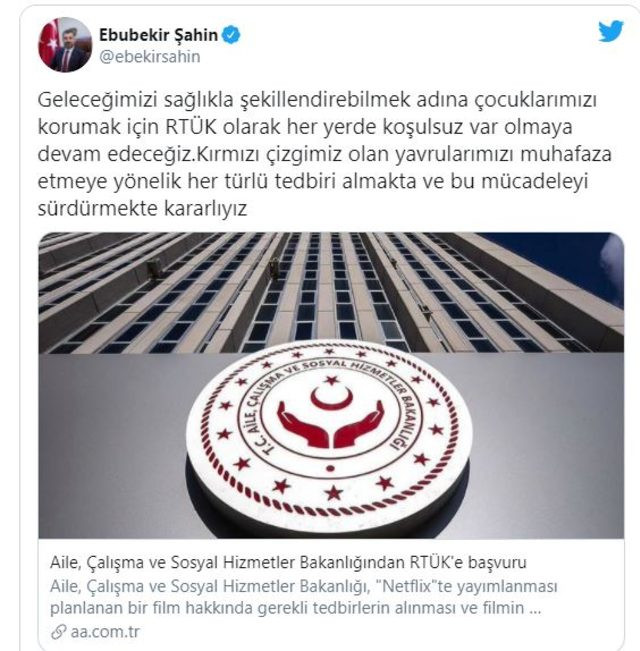 RTÜK Başkanı Ebubekir Şahin, Twitter hesabından, bakanlığın talebi ile ilgili açıklama yaptı. Şahin, her türlü tedbiri alacaklarını vurgulayarak, "Geleceğimizi sağlıkla şekillendirebilmek adına çocuklarımızı korumak için RTÜK olarak her yerde koşulsuz var olmaya devam edeceğiz. Kırmızı çizgimiz olan yavrularımızı muhafaza etmeye yönelik her türlü tedbiri almakta ve bu mücadeleyi sürdürmekte kararlıyız" ifadelerini kullandı.