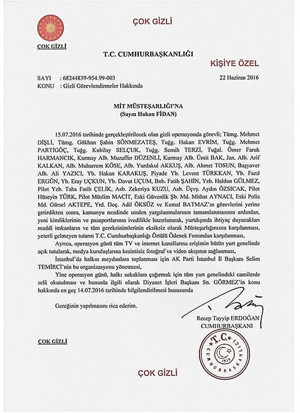 Erzurum Güncel- Cumhurbaşkanlığı'ndan MİT'e gönderildiği iddia edilen sözde belgede, darbe girişiminde görev almış FETÖ'cülerin önde gelen asker/sivil elemanları isim isim sayıldıktan sonra bunların usulen yargılanıp itibarsızlaştırıldıktan sonra MİT tarafından kimlikleri değiştirilerek gizlice yeni bir hayata hazırlanacakları, ayrıca bu kişilerin ihtiyaç duydukları her türlü harcama ve maddi desteğin MİT kaynakları yanısıra Cumhurbaşkanlığı örtülü ödeneğinden karşılanacağı öne sürülüyor.