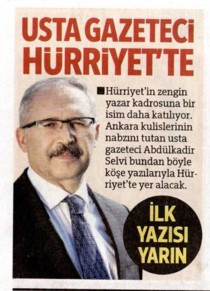 Geçtiğimiz günlerde köşesinden yazdığı veda yazısıyla uzun süredir çalıştığı Yeni Şafak gazetesine veda eden gazeteci Abdulkadir Selvi Hürriyet gazetesine transfer oldu.
