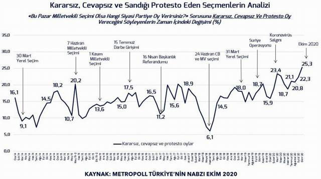 Metropoll Araştırma şirketinin sahibi Özer Sencar, tabloyu sosyal medya hesabından paylaşarak, “Metropoll’ün 2014-2020 sürecindeki aylık araştırmalarında kararsızların değişimi. Tesbit edilen en yüksek değer %25,2” notunu düştü.