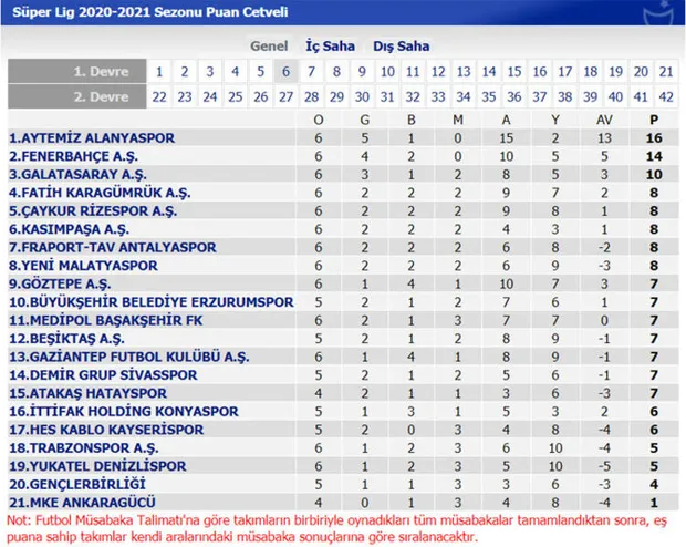 İşte Süper Lig'in 6. haftasında oynanan maçlardan sonra oluşan puan durumu