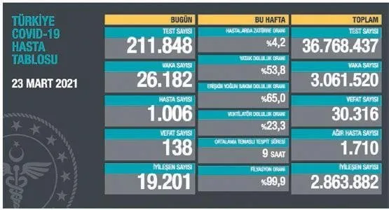 Türkiye'de dün test yapılan 211 bin 848 kişiden 26 bin 182'sine Kovid-19 tanısı konulurken, 138 kişi vefat etti, hasta sayısı ise 1006 oldu. 19 bin 201 kişinin tedavisi ya da karantinasının sona ermesiyle iyileşenlerin sayısı 2 milyon 863 bin 882'ye yükseldi.