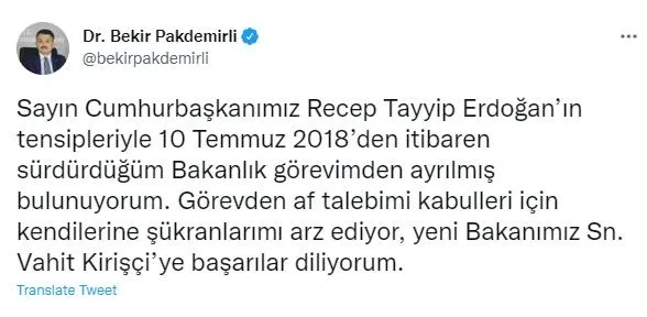 Tarım ve Orman Bakanlığı görevini Vahit Kirişçi'ye devreden Bekir Pakdemirli sosyal medyadan bir mesaj yayımladı. Pakdemirli mesajında: "Sayın Cumhurbaşkanımız Recep Tayyip Erdoğan'ın tensipleriyle 10 Temmuz 2018'den itibaren sürdürdüğüm Bakanlık görevimden ayrılmış bulunuyorum. Görevden af talebimi kabulleri için kendilerine şükranlarımı arz ediyor, yeni Bakanımız Sn. Vahit Kirişçi'ye başarılar diliyorum." ifadelerini kullandı.