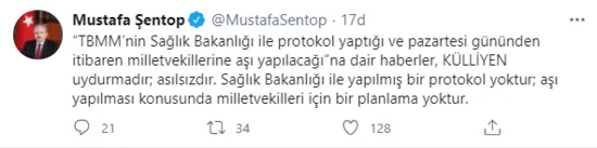 "TBMM'nin Sağlık Bakanlığı ile protokol yaptığı ve pazartesi gününden itibaren milletvekillerine aşı yapılacağına dair haberler, külliyen uydurmadır; asılsızdır." ifadesine yer veren Şentop, Sağlık Bakanlığı ile yapılmış bir protokolün bulunmadığını ve aşı yapılması konusunda milletvekilleri için planlamanın olmadığını belirtti.