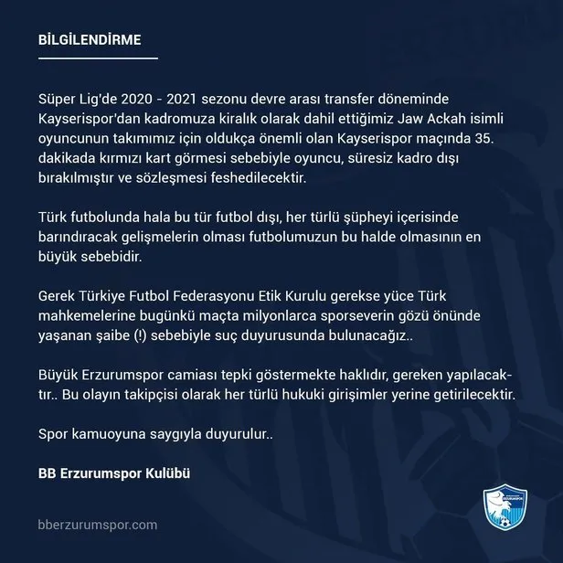 Büyükşehir Belediye Erzurumspor'dan yapılan açıklamada şu ifadeler kullanıldı: "Süper Lig'de 2020-2021 sezonu devre arası transfer döneminde Kayserispor'dan kadromuza kiralık olarak dahil ettiğimiz Jaw Ackah isimli oyuncunun takımımız için oldukça önemli olan Kayserispor maçında 35'inci dakikada kırmızı kart görmesi sebebiyle oyuncu, süresiz kadro dışı bırakılmıştır ve sözleşmesi feshedilecektir. Türk futbolunda hala bu tür futbol dışı, her türlü şüpheyi içerisinde barındıracak gelişmelerin olması futbolumuzun bu halde olmasının en büyük sebebidir.