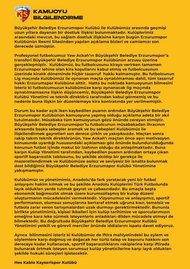 Profesyonel futbolcumuz Yaw Ackah'ın Büyükşehir Belediye Erzurumspor'a transferi Büyükşehir Belediye Erzurumspor Kulübünün arzusu üzerine gerçekleşmiştir. Kulübümüz, bu futbolcusunu kiraya verirken tamamen Erzurumspor lehine olan kira koşullarını kabul etmiş ve futbolcusunun üzerinde kiralık döneminde hiçbir tasarruf hakkı kalmamıştır. Bu futbolcunun Lig maçında Kulübümüz ile oynanan maçta oynatılmaması dahil, tüm tasarruf hakkı Erzurumspor Kulübüne aittir. Hatta bu noktada kamuoyunun bilmesini isteriz ki futbolcumuzun kulübümüze karşı oynanacak lig maçında oynatılmamasına ilişkin düşüncemiz, Büyükşehir Belediye Erzurumspor Kulübü Yönetimi ve teknik direktörü tarafından kabul görmemiş ve bu nedenle buna ilişkin bir düzenlemeye kira kontratında yer verilmemiştir.