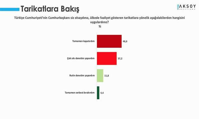 Aksoy Araştırma’nın yaptığı tarikat anketine katılan yurttaşların yüzde 46,6’sı bu soruya tarikatları “tamamen kapatmayı”, yüzde 37,2’si ise “çok sıkı denetim yapmayı” tercih edeceğini belirtti.