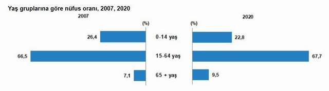 Çalışma çağı olarak tanımlanan 15-64 yaş grubundaki nüfusun oranı, 2007 yılında yüzde 66,5 iken 2020 yılında yüzde 67,7 oldu. Diğer yandan çocuk yaş grubu olarak tanımlanan 0-14 yaş grubundaki nüfusun oranı yüzde 26,4’ten yüzde 22,8’e gerilerken, 65 ve daha yukarı yaştaki nüfusun oranı ise yüzde 7,1’den yüzde 9,5’e yükseldi.