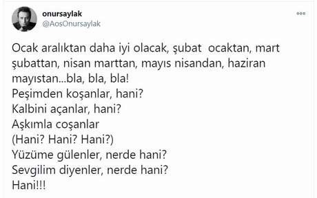 Onur Saylak, Berak Albayrak’ın bu konuşmasına gönderme yaparak Neco’nun “Hani” şarkısının sözlerini paylaştı. Saylak, Neco şarkısıyla da Albayrak’ın bir süredir kamuoyuna çıkmamasına işaret etmiş oldu.