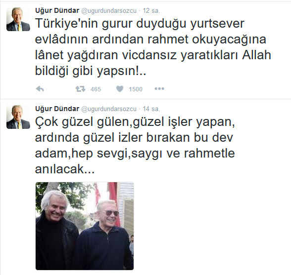 66 yaşında yaşama veda eden Akan için sosyal medyada olumsuz mesajlar da paylaşıldı. Usta gazeteci Uğur Dündar bu mesajlara paylaştığı bir twitle tepki gösterdi.